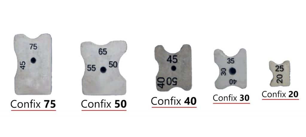 اسپیسر بتنی جهت تامین کاور آرماتور بندی بتن سقفی ، کفی و فاصله گذاری قوی ارماتور قطعات سنگین وزن سازه نظیر فونداسیون و بتن ریزی کف سازی صنعتی ، ایجاد پوشش زیر میلگرد حرارتی دال بتنی ، سقف وافل و انواع ستون ، دیوار برشی ، پله ، تیر و سایر المان های ساختمانی با مشخصات فنی ویژه طراحی و تولید گردیده است. لقمه سیمانی بصورت عمودی روی قالب بندی قرار میگیرند و همانطور که در عکس فوق دیده میشود هر کدام از اسپیسر ها بتنی دارای ضخامت های مختلفی از 2.5 سانت تا 7.5 سانتی می باشد. از طرف دیگر پژوهش ها موید این مطلب است که بر خلاف اسپیسر های پلاستیکی ( پی وی سی ) تشابه جنس اسپیسر ها بتنی و سازه در پوزولان موجب کاهش نفوذپذیری آب و مواد شیمیایی می شود که مورد اخیر به ویژه در آب بند از اهمیت بسزایی دارد.